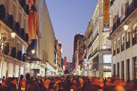 Madrid, Spain. 11 03 2018. Preciados street crowded at dusk. Tourists and local shopping in the center of Madrid.