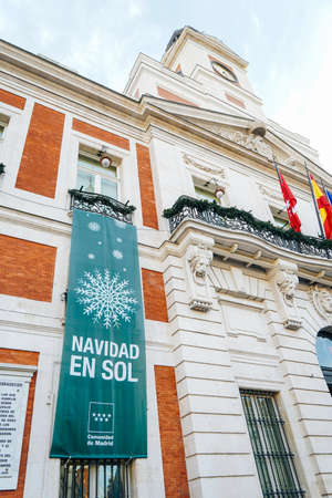 MADRID, SPAIN - DECEMBER 26th, 2019: Government building of the Community of Madrid with a Christmas poster