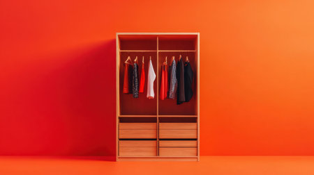 A stylish wardrobe organized with various clothing items, set against a vibrant orange background, ideal for showcasing modern interior design concepts.