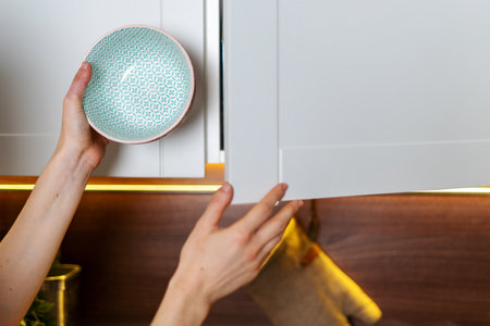 Cropped view of woman standing at modern kitchen, open white wooden door and puts ceramic dishes in the cupboard. Housewife cleans room at contemporary and comfortable home