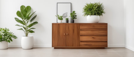 Interior of modern living room with wooden commode, 3d render