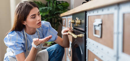 young adult woman in apron looking at timer on oven and gesturing with hand in modern kitchen, banner