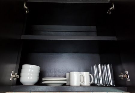 White kitchenware in black cupboard, closeup