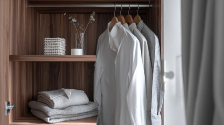 A close-up view of a well-organized wooden wardrobe showcasing folded textiles and hanging shirts, emphasizing modern storage solutions and stylish home decor.