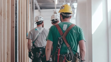 Sunlit construction team diligently working atop a scaffold, emphasizing the importance of safety gear in urban settings.