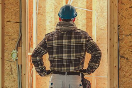 Caucasian Contractor Worker in His 40s Wearing White Hard Hat in Front of Newly Built House Interior.
