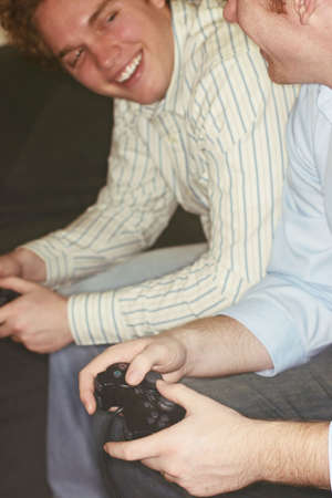 Bearded man and guy using joysticks for playing in video game while sitting on sofa at home