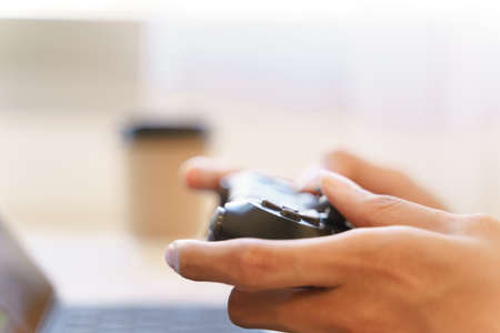 Closeup Hand of woman playing a computer games with joystick, copy space.