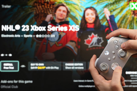 New york, USA - February 20, 2023: Play NHL game on computer console with xbox joystick in hand close up view