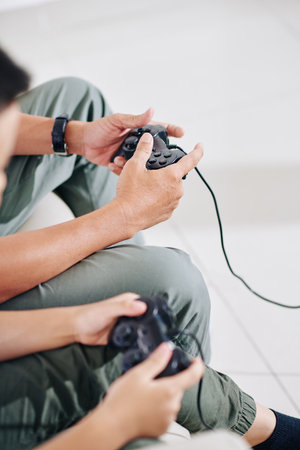 Close up of preteen boy hands using a joystick while playing video games at home