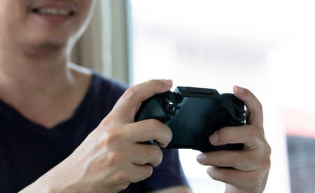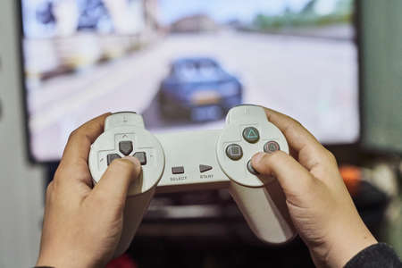Entertainment, home electronics, gaming concept: a teenager hands holding wireless controller gamepad playing console video game