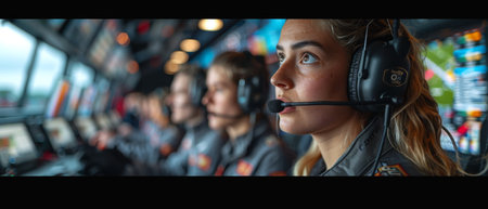 Sports broadcasting control room, technicians monitoring live sports feeds, multiple screens, high-energy setting