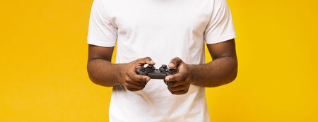Unrecognizable african american man with joystick playing videogames, panorama