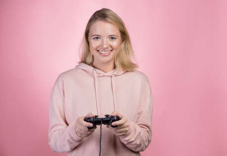 A gamer who is passionate about the process. A cute blonde is holding a gamepad