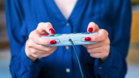 Woman using retro gaming console controller. Gaming, hobby, technology and leisure time concept