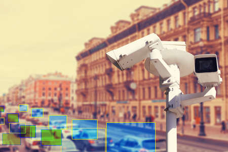 The concept of video surveillance and security technologies. Video surveillance camera on the background of the city road with cars. Definition zone.