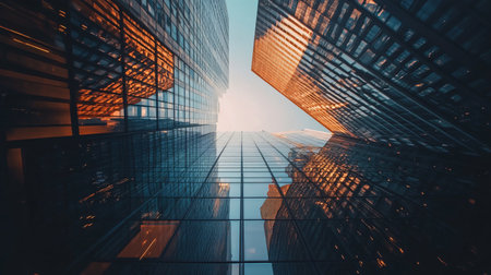 An upward perspective captures a cluster of towering skyscrapers. The buildings exhibit a symmetrical arrangement. The composition highlights the geometric lines. Ideal for visual representations, this image could be suitable for various commercial or editorial applications.