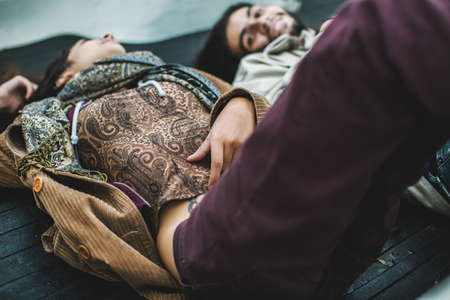 Male hand undressing young sensual woman with bare belly in torn blue sexy jeans lying in studio on dark background closeup, horizontal picture