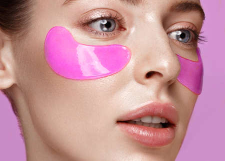 Healthy beautiful girl with natural makeup applies collagen catches for eyes and lips to make her skin routine and look fresh. Close up portrait of beautiful model doing skin care.
