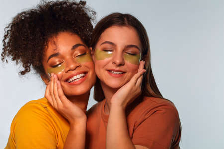 SPA day. Two multiracial girls with eye patches close to each other cheek to cheek, smiling pleasantly with eyes closed, happy girlfriends enjoying skincare tratment on blue bacground