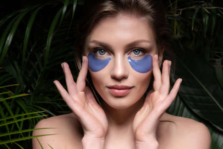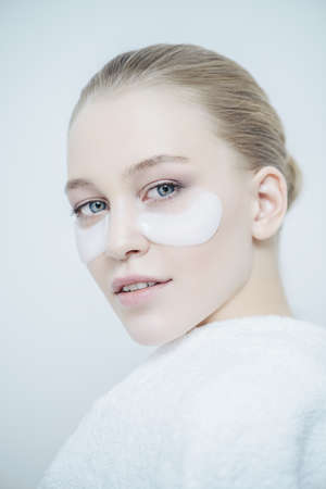 Beautiful fresh girl with cosmetic patches under the eyes, perfect skin and natural make-up. Beauty face. Photo taken in the studio.