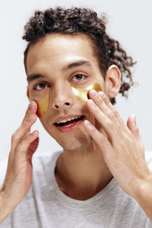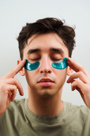 Young man with sensitive skin wears hydrogel patches under his eyes. Male skincare routine at home
