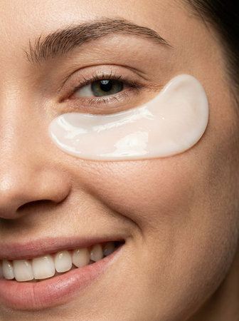 Beauty close up portrait of a young woman applying a facial care product. She has a healthy skin. Cream smear.