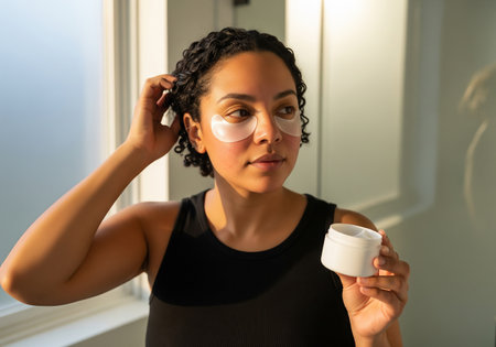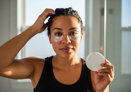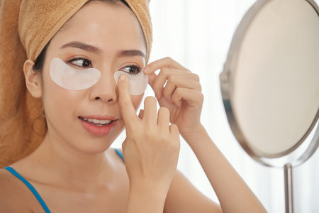 Young woman applying moisturizing undereye patches as part of morning beauty routine