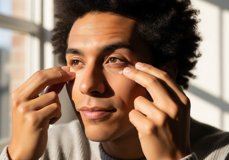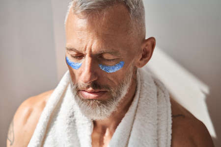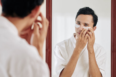 Mixed-race young man standing in front of mirror and applying undereye patches after morning shower