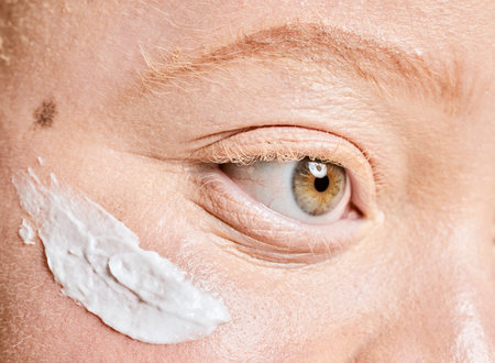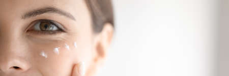 Close up wide cropped image female eye and cheekbone with white face cream, beautiful young woman applying moisturizing lotion, looking at camera, enjoying skincare routine and spa procedure