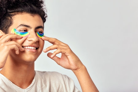 A young handsome guy with black curly hair applying cosmetic patches of rainbow color under his eyes in studio. Swarthy smiling man practicing skincare to maintain his youthful and healthy appearance.