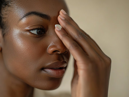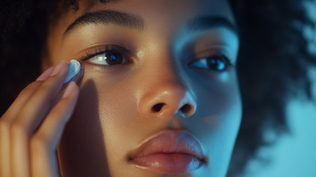 Minimal portrait of young African-American woman using face cream or moisturizer, skincare and beauty routine concept