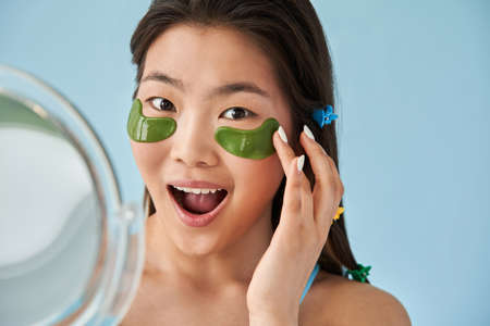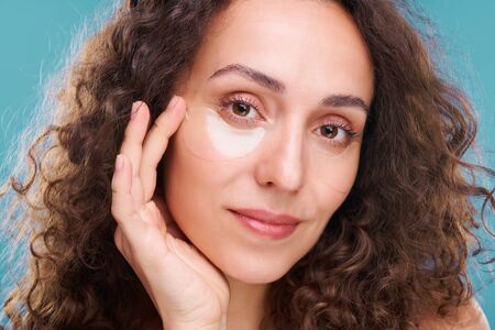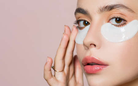 Portrait of beautiful girl with under eye patches. Young woman applying collagen eye mask for puffy. Face skin care and beauty treatment concept.