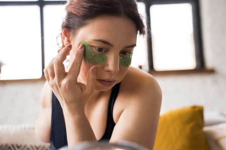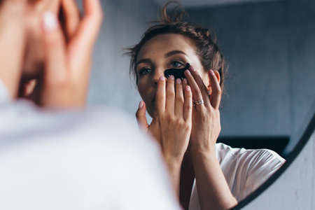 Brunette woman looking at the mirror applying black eye patches with fingers