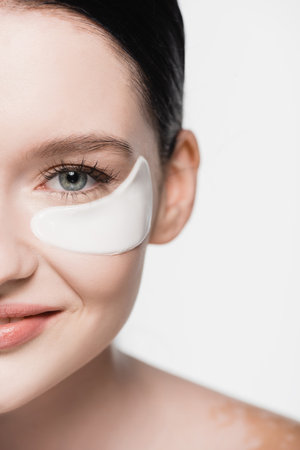 cropped view of smiling young beautiful woman with vitiligo and eye patches on face isolated on white