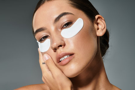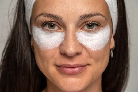 portrait of a young satisfied woman with cosmetic product under her eyes on a gray background
