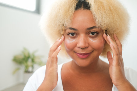 Close up portrait of young African American woman with curly blonde hair with moisturizing patches under her eyes. Skin care in adulthood. Preventing wrinkles and bags under the eyes. Morning routine.