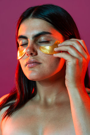 Studio portrait of a young woman with closed eyes, applying golden eye patches to her face, demonstrating a skincare routine for reducing wrinkles and dark circles