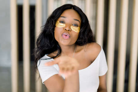 Beauty treatment at home. Front view of beautiful young African woman with golden eye patches, posing at home bedroom, making air kiss and looking at camera while having beauty procedures.