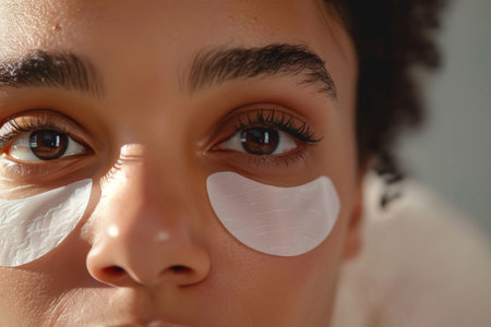 A woman gently cares for her skin with eye patches, showcasing a calm and radiant expression.