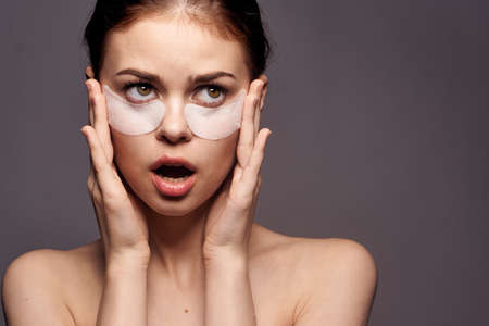 portrait woman with patches on the face clean skin health rejuvenation Gray background