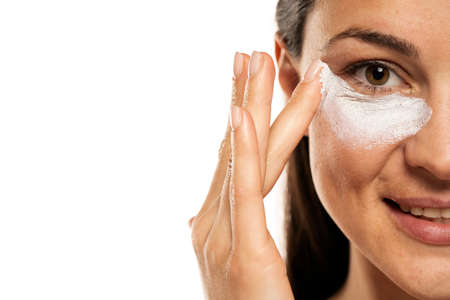 Half portrait of a young woman with cosmetic product under her eye on a white background