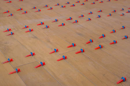 New tile floor home renovation project, large format ceramic tiles with wood texture, plastic levelers and a notched trowel for mortar. Tile leveling system. SVP