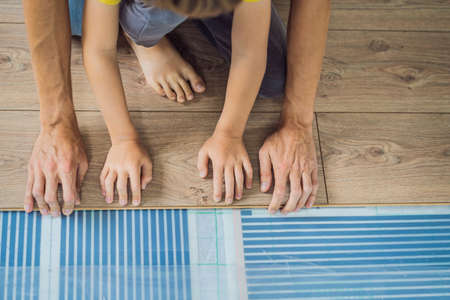 Father and son installing new wooden laminate flooring on a warm film floor. Infrared floor heating system under laminate floor