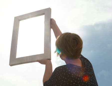 girl holds cardboard frames in her hands and looks at the sun. portrait