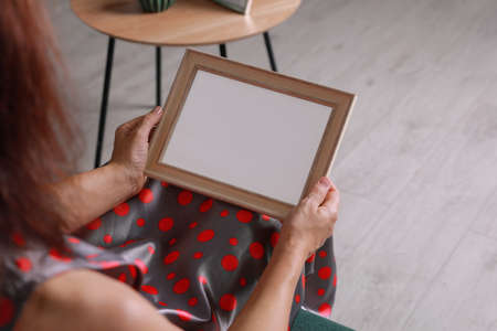 Diploma or certificate mockup. Empty photo frame border in woman hands close up.