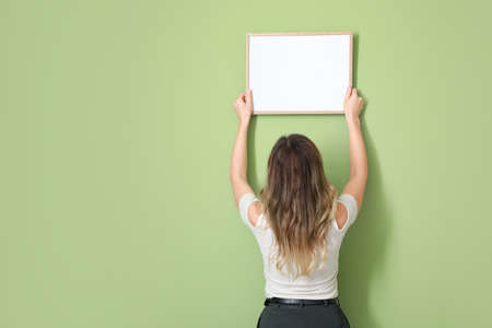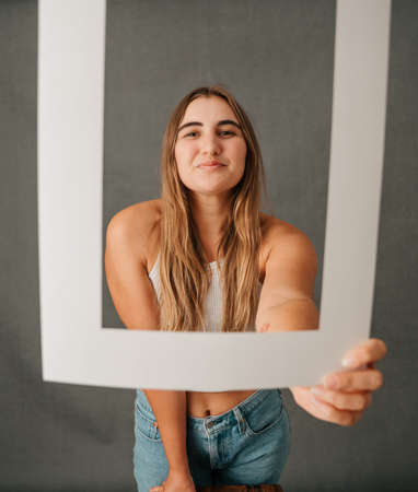 Diploma or certificate mockup. Woman is hiding her face behind an empty photo frame border on a gray background.