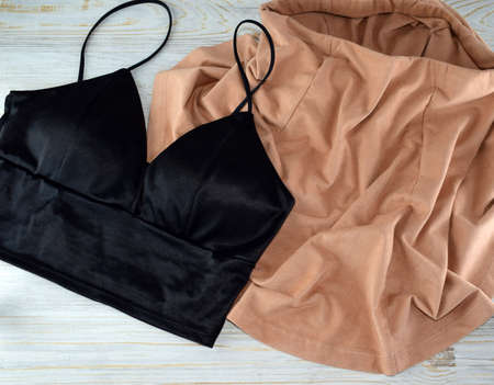 Fashion and blogger flatly on a light wood background. Top view women clothes. Brown, beige soft suture mini skirt or scarf. Black women silk top, undershirt.