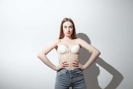 Sexy fashionable vogue woman model in corset on white background