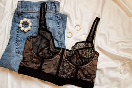Lace underwear on a beige silk, top view. Fashion concept.